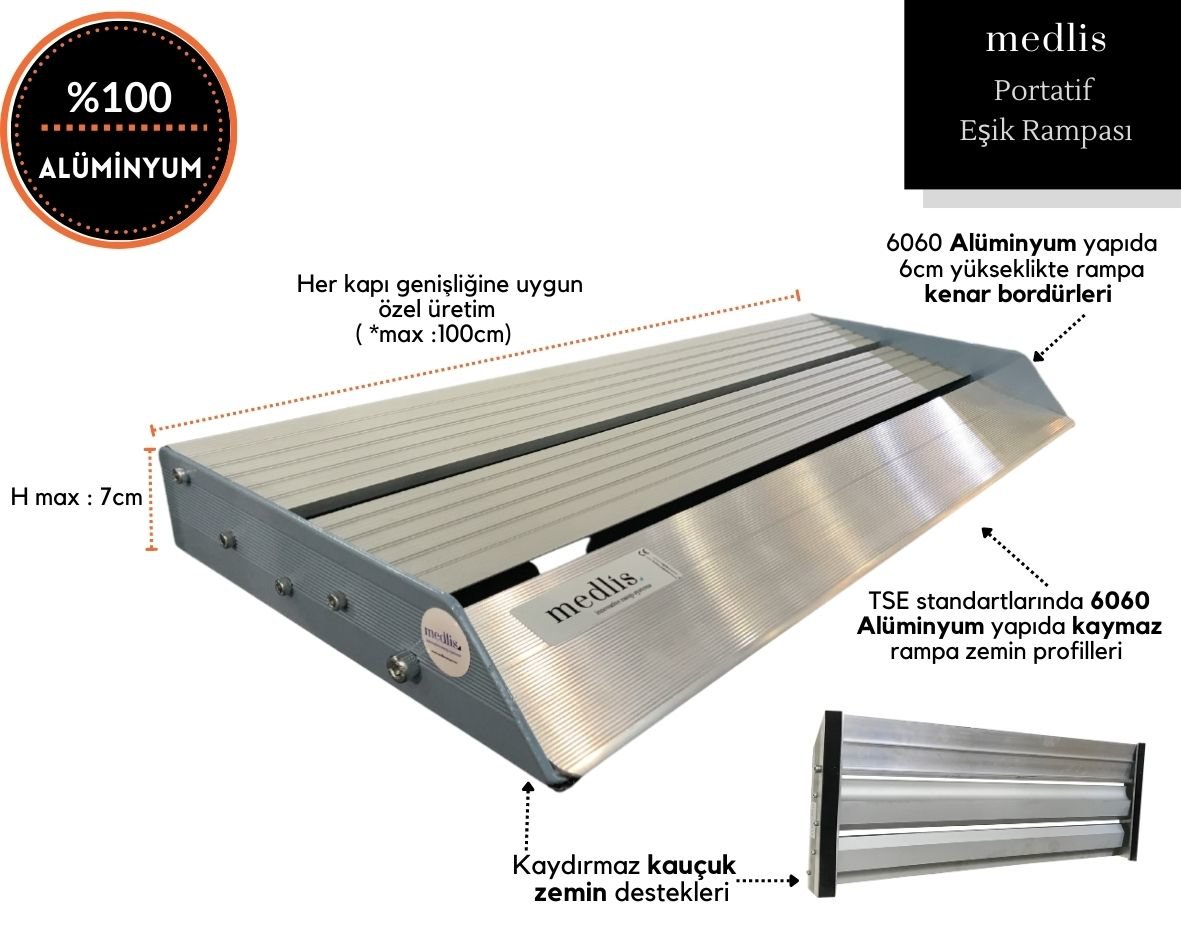 Portatif ve pratik kullanım sunan, alüminyum yapıda tek yönlü engelli kapı eşik rampalarıdır.