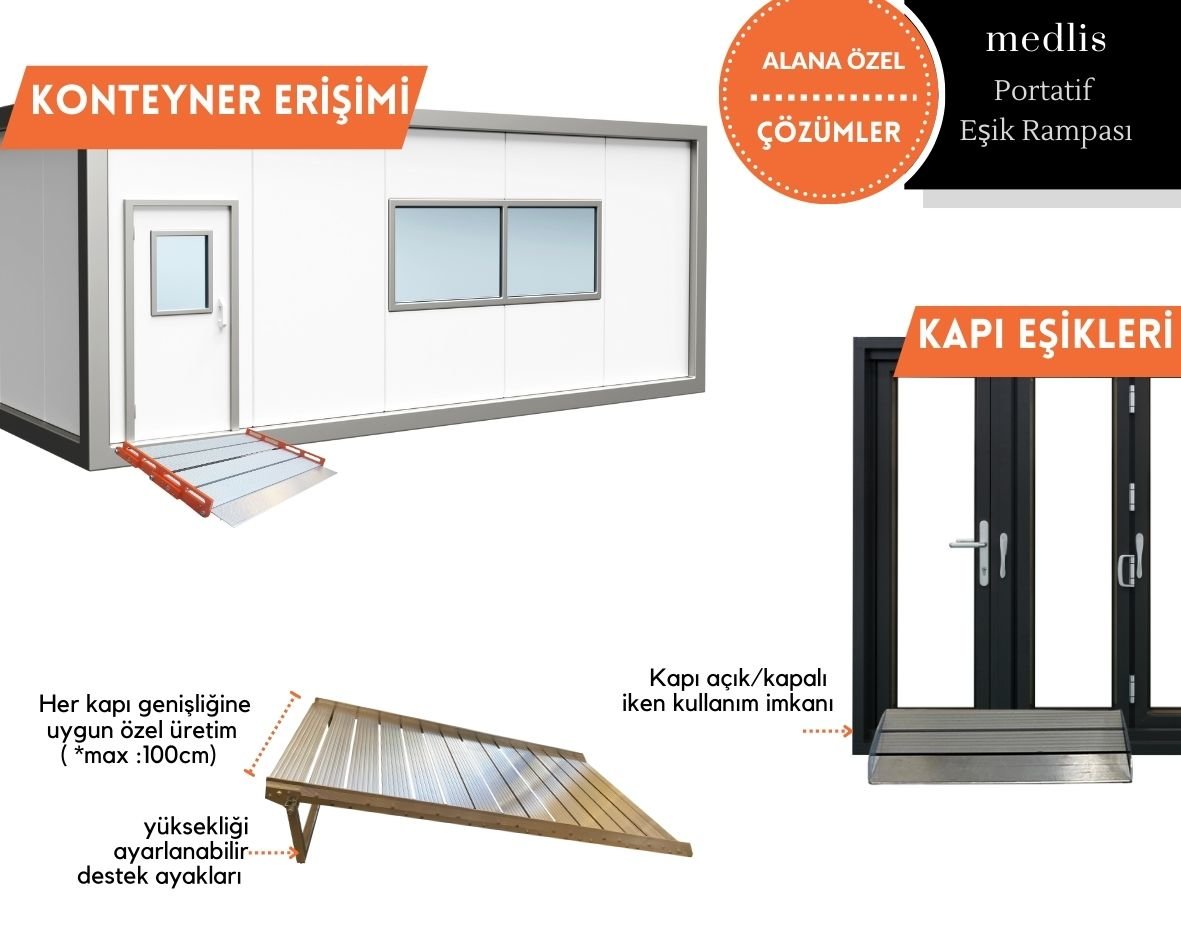 Tekerlekli sandalye kullanıcılarının konteyner erişiminde kullanılan konteyner rampaları, talep edilen yükseklik ve genişliklerde üretilir. Gerek duyulması halinde zemine monte edilebilir veya portatif kullanılabilir.
